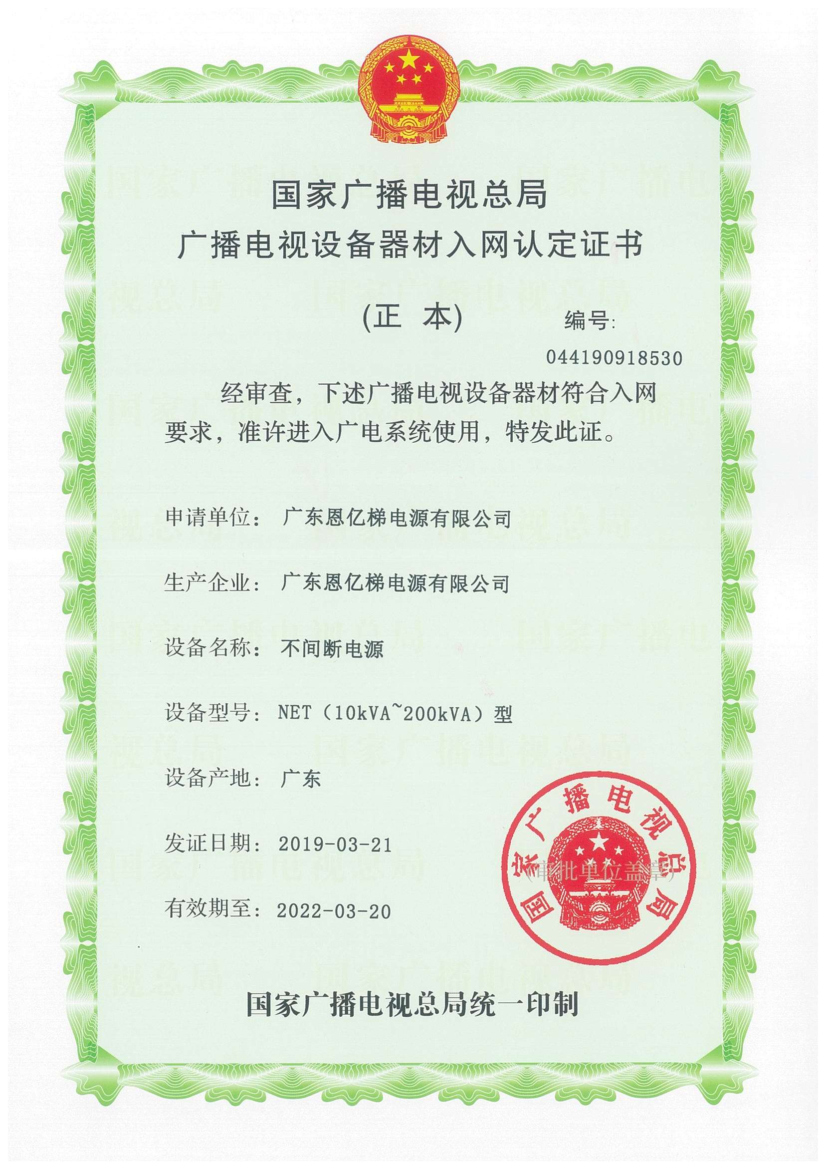 國(guó)家廣播電影電視總局入網(wǎng)認(rèn)定證書(交流穩(wěn)壓電源)