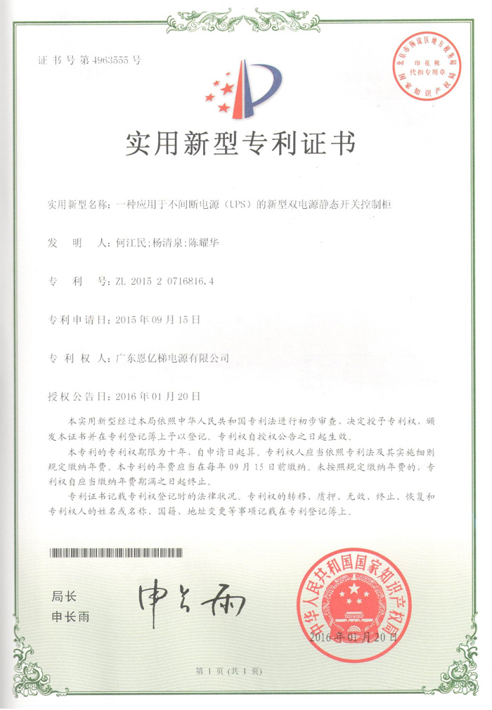 專利證書(一種應(yīng)用于UPS的新型雙電源靜態(tài)開關(guān)控制柜)