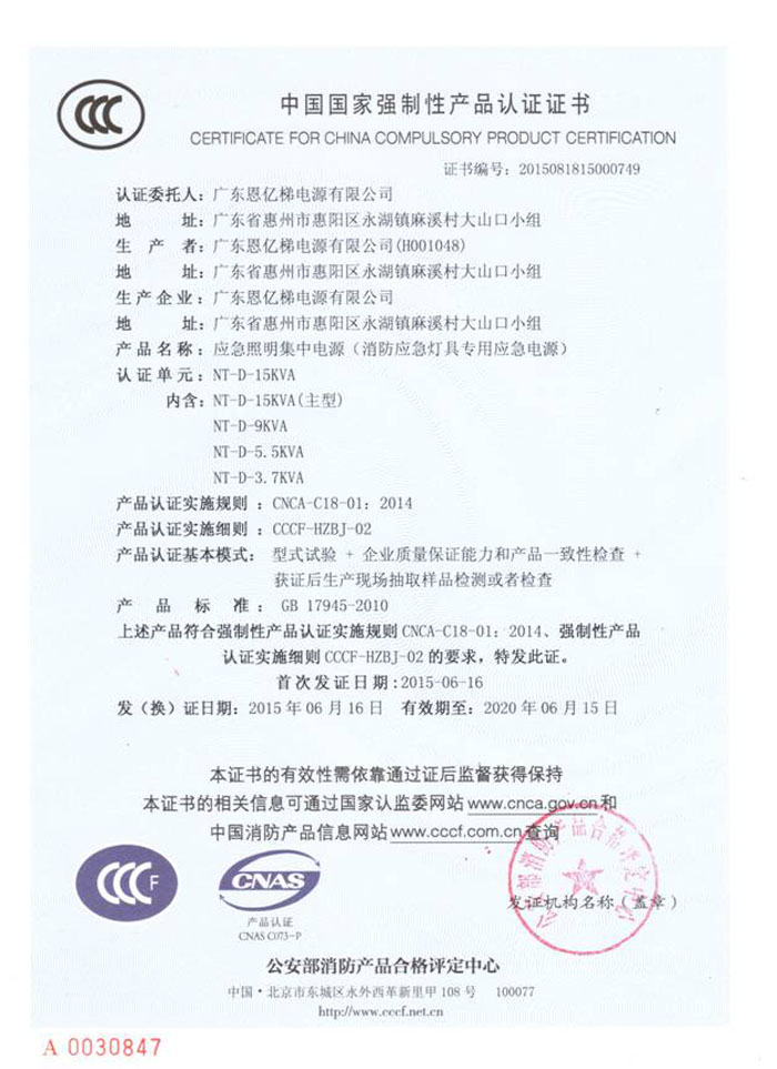 中國國家強制性產品認證(消防應急燈具專用應急電源)